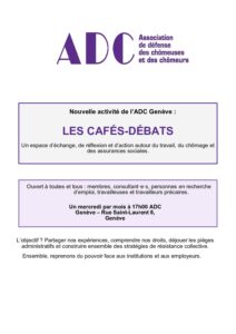 Nouvelle Activité de l’ADC Genève :LES CAFÉS-DÉBATS Un espace d’échange, de réflexion et d’action autour du travail, du chômage et des assurances sociales. Ouvert à toutes et tous : membres, consultant·e·s, personnes en recherche d’emploi, travailleuses et travailleurs précaires. Un mercredi par mois à 17h00 ADC Genève – Rue Saint-Laurent 8, Genève |